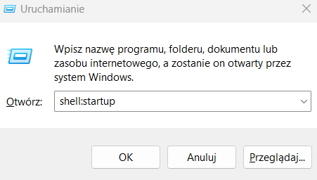 Po wykonaniu tej czynności naciśnij klawisz systemowy z logo Windows oraz R. W okienku, które się pojawi wklej komendę shell:startup i kliknij „ok”.
