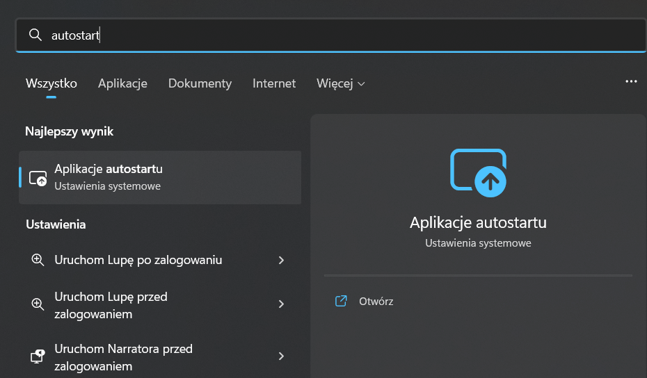 W systemie operacyjnym windows 10 programy startowe znajdziesz, wpisując w pasku wyszukiwania w menu Start „autostart” – pełna nazwa programu to „Aplikacje autostartu”.