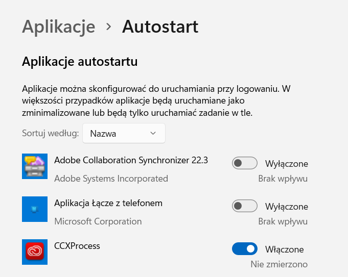 System zaprezentuje listę programów, którą możesz posortować według nazwy, stanu (włączona/wyłączona) lub wpływu na uruchomienie systemu, choć ta ostatnia funkcja nie działa zbyt precyzyjnie.