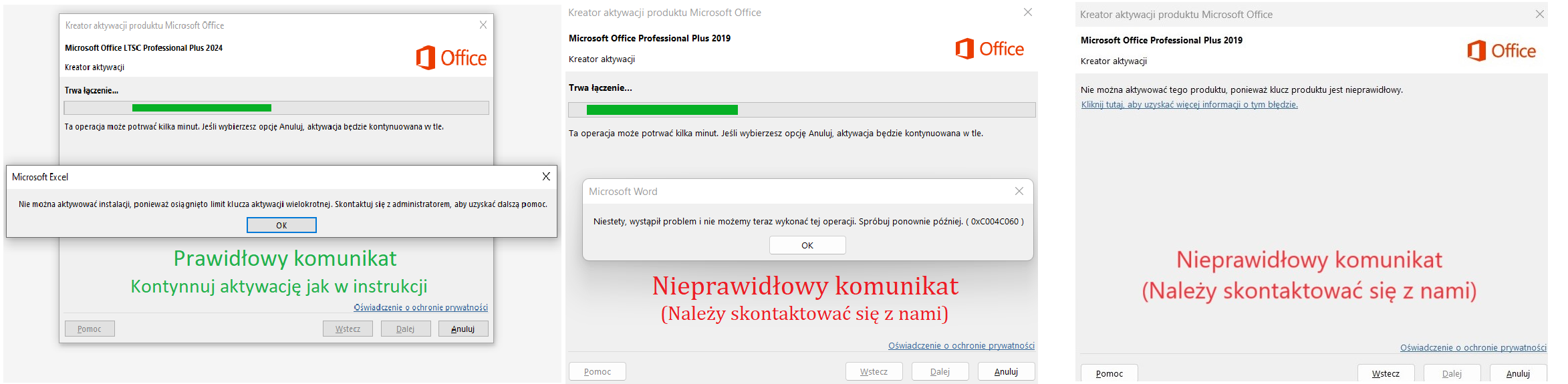 W przypadku komunikatu 0xC004C060 lub Klucz został rozpoznany jako nieprawidłowy - skontaktuj się z nami w celu wymiany klucza, nie kontynuuj procesu aktywacji!