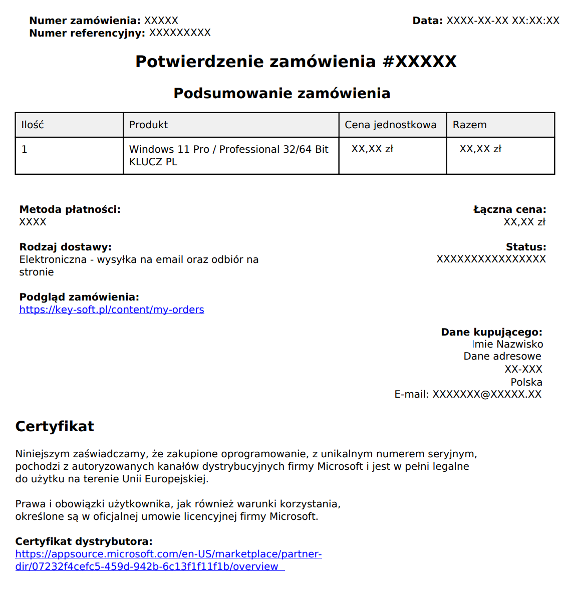 Potwierdzenie zakupu jest dostępne do odebrania po zakupie - na emailu oraz na stronie.